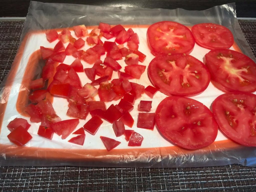 - Поднос следует застелить пищевой пленкой или пергаментной бумагой, разложить нарезанные кружочки томатов таким образом, чтобы они не соприкасались друг с другом.