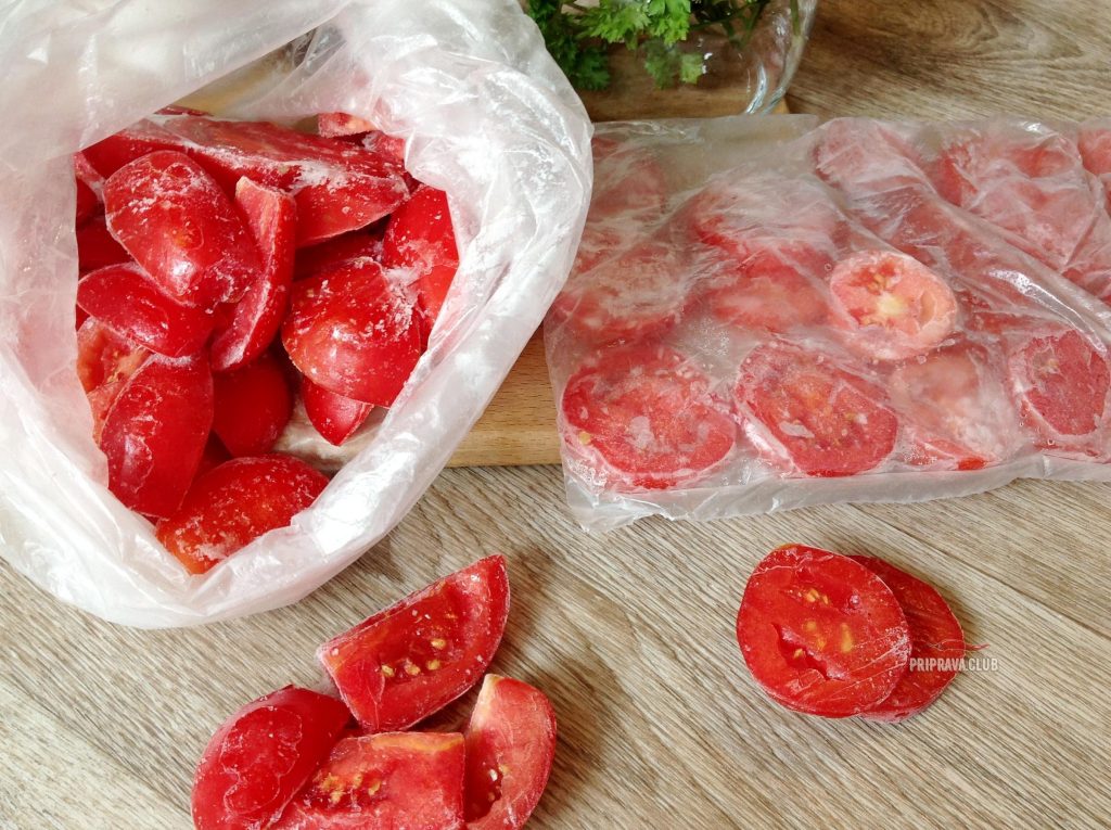 Так же стоит поступать и с порезанными кубиками помидорами. Их добавляют исключительно во время готовки блюда, предварительно не размораживая.