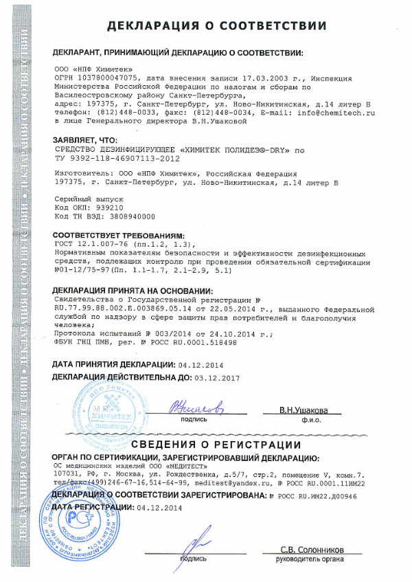 Дезинфицирующие средства должны сопровождаться декларацией о соответствии. Этот документ подтверждает целевую эффективность дезинфектанта в соответствии с требованиями Нормативных показателей безопасности и эффективности дезинфекционных средств, подлежащих контролю при проведении обязательной сертификации №1-12/75-97, а также класс опасности средства по ГОСТ 12.1.007-76.