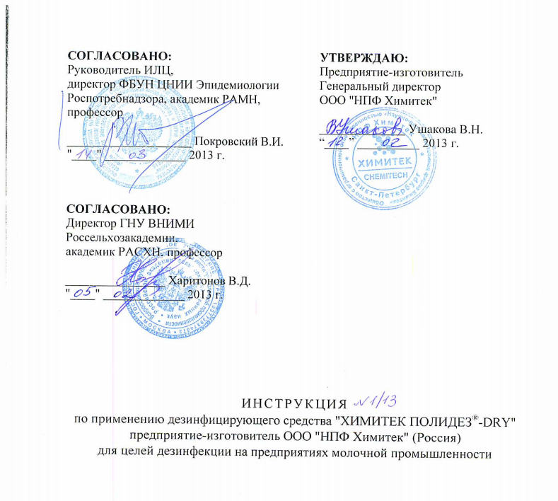 Второй возможный вариант оформления — инструкция, разработанная производителем дезинфицирующего средства совместно с НИИ Дезинфектологии Роспотребнадзора. Титульный лист такой инструкции заверен подписью и печатью производителя средства и НИИ Дезинфектологии Роспотребнадзора.