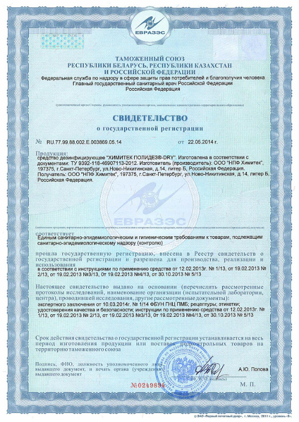 Свидетельство о государственной регистрации в обязательном порядке должно содержать перечень инструкций по применению и подпись Главного санитарного врача РФ (до 2013 года — Онищенко Г.Г., а после 2013 года — Попова А.Ю.). Экспертное заключение, на основании которого выдано данное СГР, должно быть оформлено учреждением Федеральной службы Роспотребнадзора.