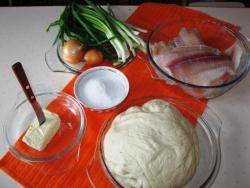Филе рыбы, лук репчатый и зеленый, соль, тесто, масло – все продукты, которые нам нужны для кулебяки