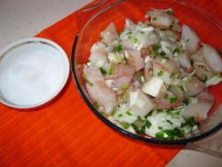 Оба вида лука смешиваем с кусочками рыбы и солим по вкусу.